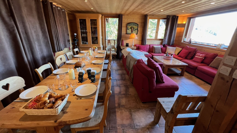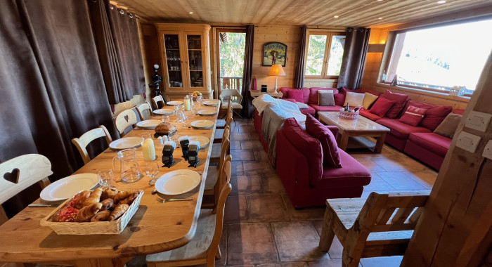 The chalet sleeps up to 12 people in six cosy, en-suite bedrooms, so there’s plenty of space for everyone to relax. The open-plan lounge and dining area is a real gem, with huge windows that let in loads of natural light and give you amazing views over the resort and snowy peaks beyond.