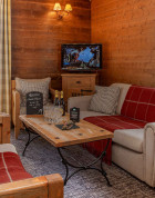Comfortable En-Suite Bedrooms & Relaxed Living - Each bedroom is compact but thoughtfully laid out, with en-suite facilities in every room for added comfort and privacy. The open-plan living/dining room is the chalet's heart, featuring a striking stone fireplace, soft sofas, satellite TV, and a generously sized dining table for group meals and relaxed evenings.