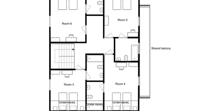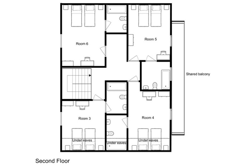 Rm 4 Twin (sleeps 2) - Twin | Approx. 14m2 | En-suite bathroom with a bath, wall affixed shower attachment, sink and WC | Bathroom under eaves (limited headroom) | Shared balcony