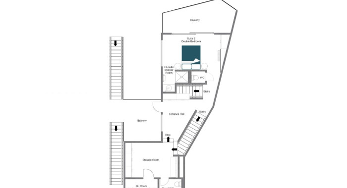 Bedroom with double bed (160x200cms) and en-suite shower room, shared WC, balcony, TV