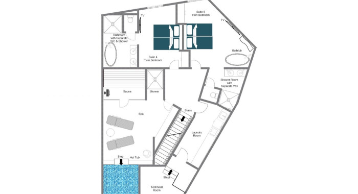 2 en-suite bedrooms with twin beds (90x200cms), both with WC, shower and bath, TV