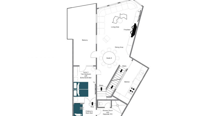 Family suite with twin beds (90x200cms) and an additional children’s bunk bed sleeping 2, en-suite shower room with separate WC, access to balcony, TV